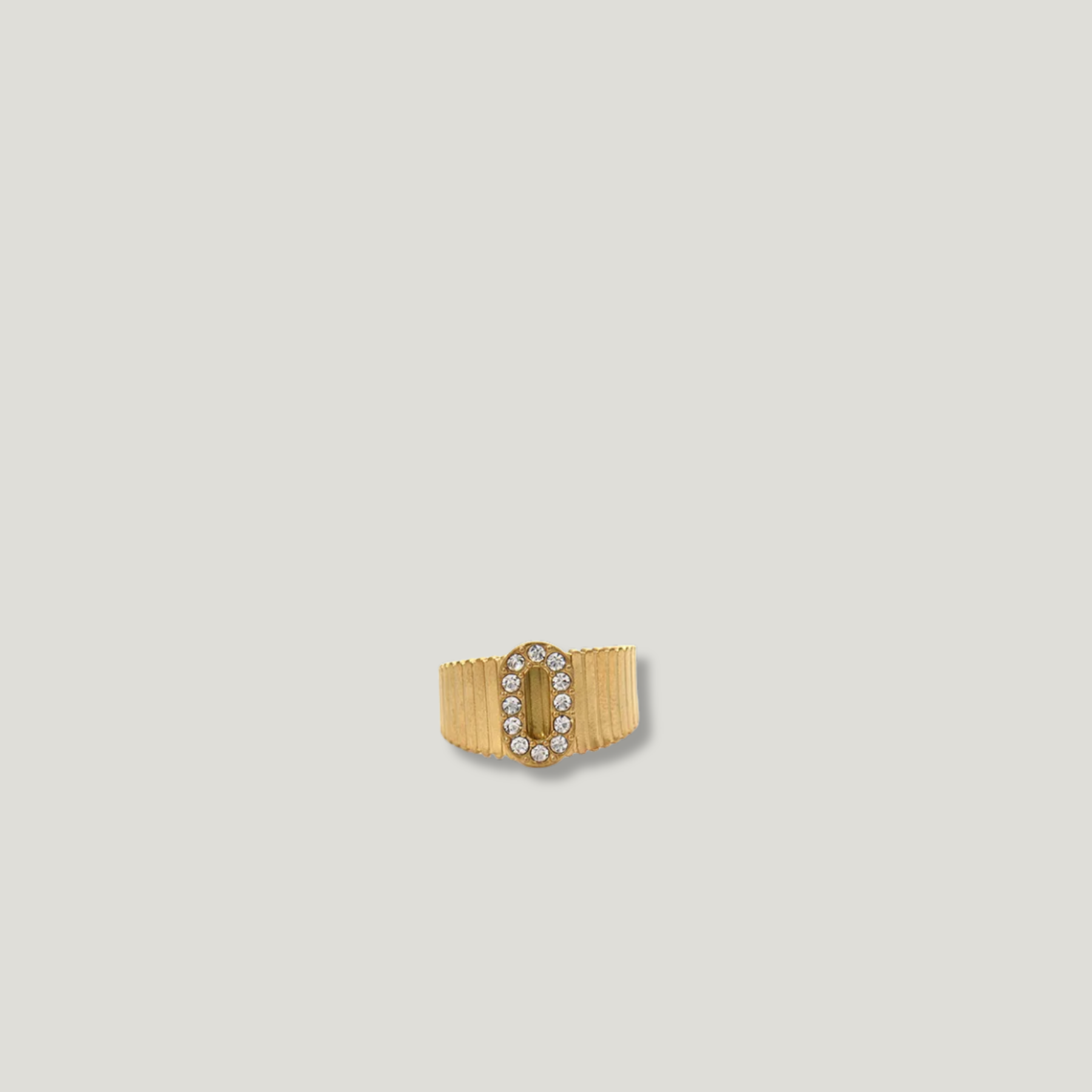 Enhance your style with this sophisticated 14K gold-plated ring, made from durable 304 stainless steel and featuring a high-quality ion plating for a lasting shine. The ring boasts a sleek, ribbed band design complemented by a stunning oval-shaped zircon setting at the center, offering a luxurious and eye-catching look. Its lightweight design makes it comfortable for all-day wear, while the shiny gold finish adds a modern, chic touch to any outfit.